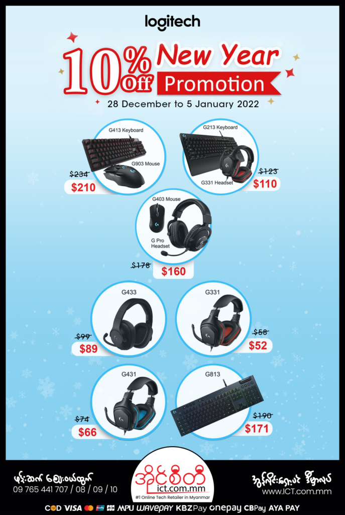 29 Dec News, Promotion Pro Gamer တို့အတွက် Logitech ရဲ့ 10% Off “New Year” Promotion December 29, 2021 By ICT.com.mm 0 comments အရည်အသွေးမြင့် Gaming Headset, Keyboard နဲ့ Mouse တွေကို ဆယ်ရာခိုင်နှုန်း Discount ပေးမှာမို့ အနည်းဆုံးငွေကျပ်တစ်သောင်းကနေ အများဆုံး...Continue reading